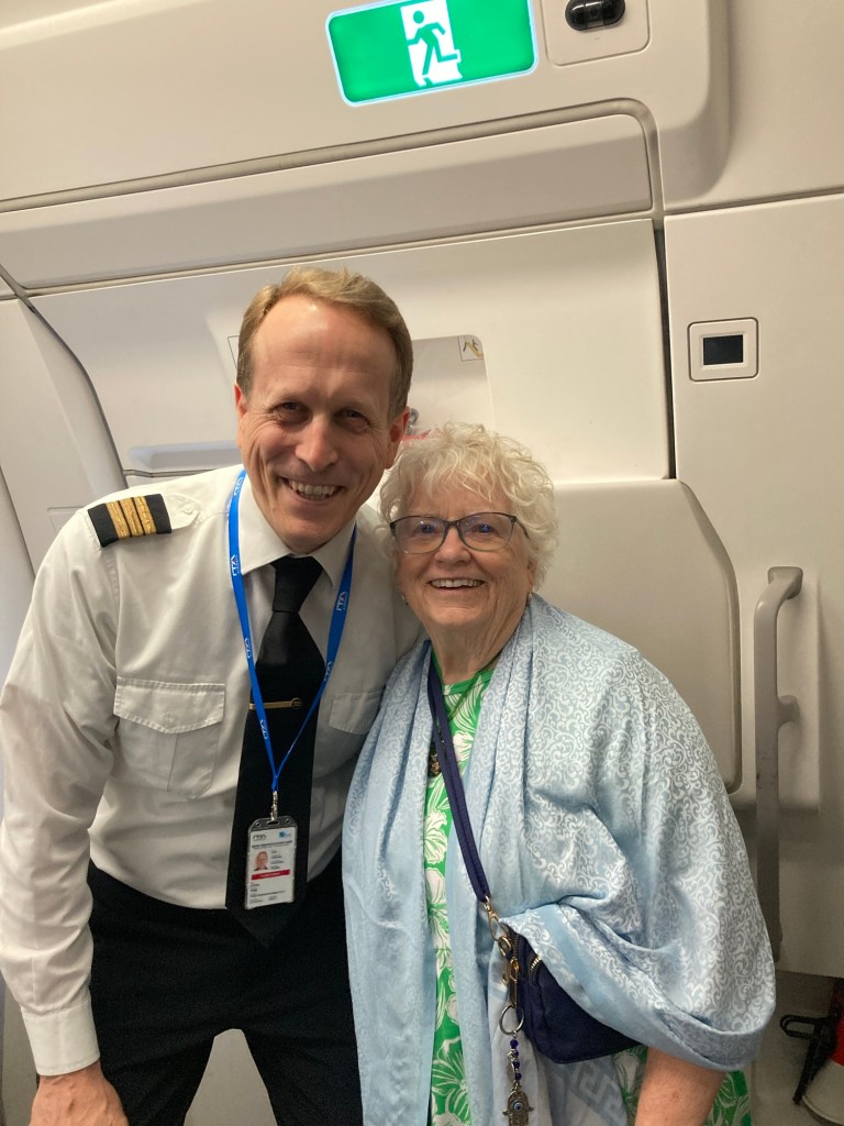 Was a direct flight. 14 and a half hours. I was flying business class as the cruise line bought the ticket as part of the round the world trip.Imagine my delight to have a cubicle of my own with a huge tv and a seat that could be upright, leaning back, or flat so could l sleep. A pillow and blanket helped me. I slept twice, ate twice and watched 2 movies. Landed at 1:20. Audrey picked me up and I hugged her a lot! My luggage is arriving tomorrow. Did not make it to the larger plane. Going home tomorrow after the luggage gets here.