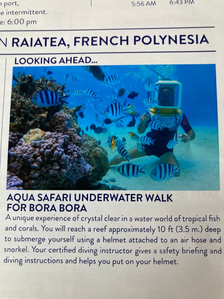 Spent first day at this beautiful island completely wiped out from yesterday. Stayed in ship. Tomorrow we have a big day at a beach snorkeling. Also the tour includes an underwater aqua safari walk. At dinner it was announced that there was a huge tropical storm coming our way and we would be going back to Papeete dock.
