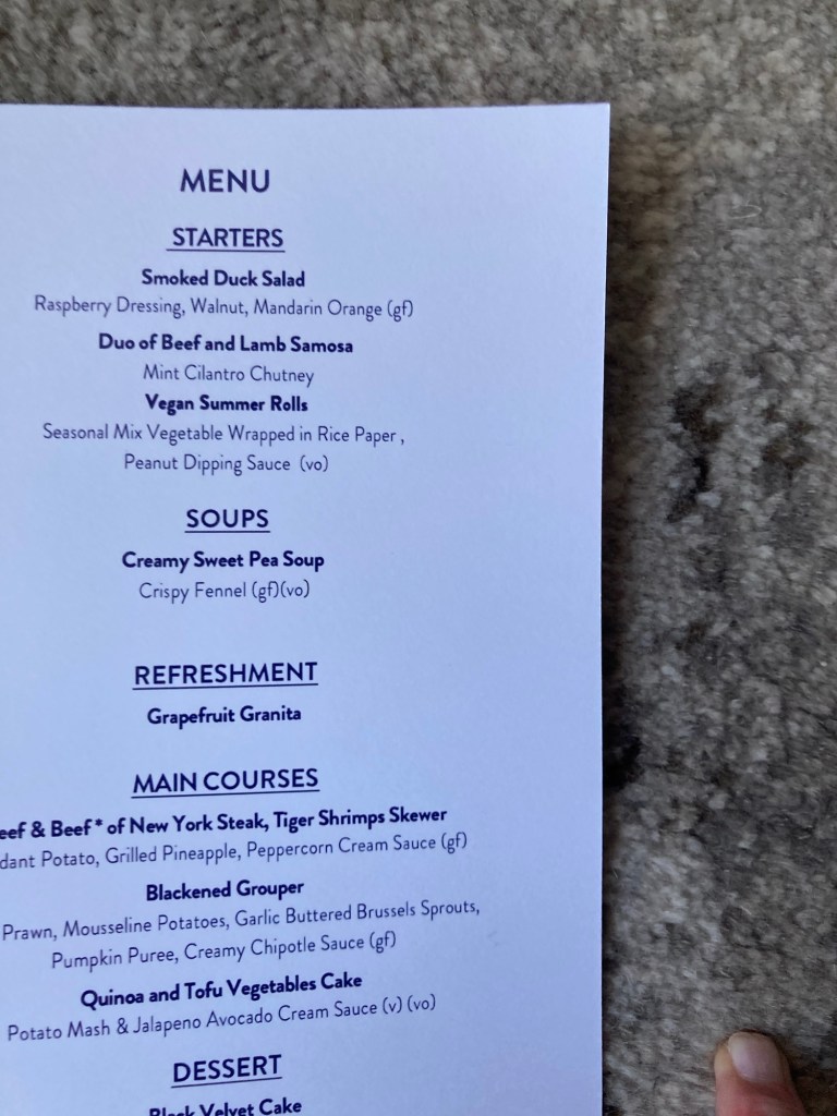 Sea is calmer and everyone is happier. Big surprise! We were invited to sit at the Captain’s table for dinner! It was so much fun. There were 12 at the table and I am enclosing the menu. I was placed at the Captain’s right side. He just got on the ship in Papeete (the first time! He is from Italy and now lives in Lima with his wife. She is delightful and travels with him.