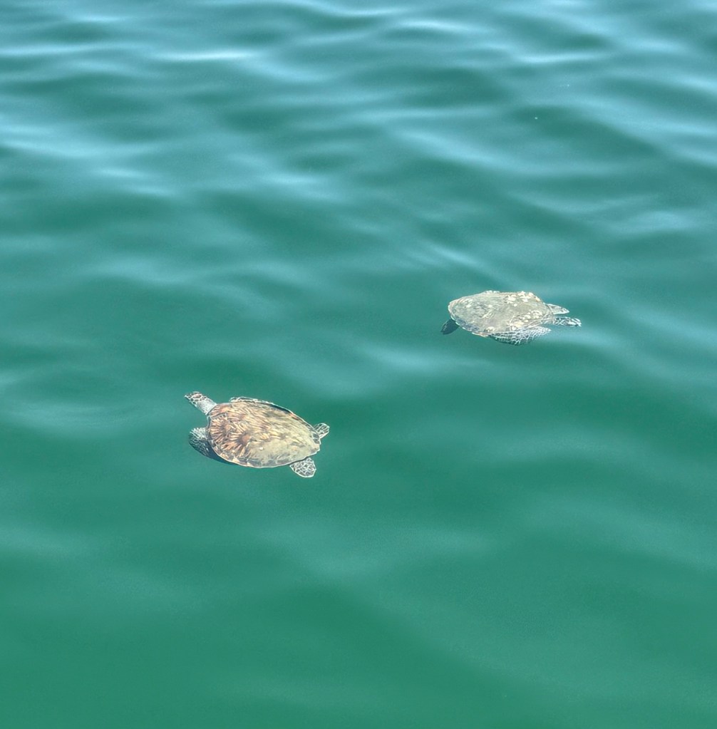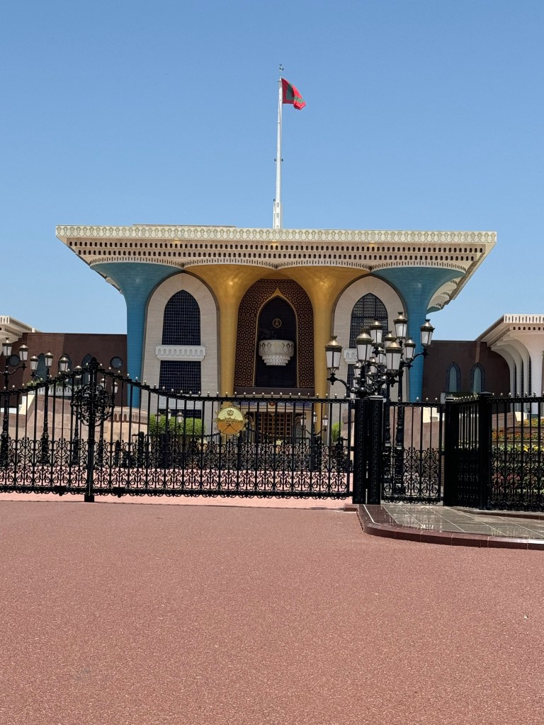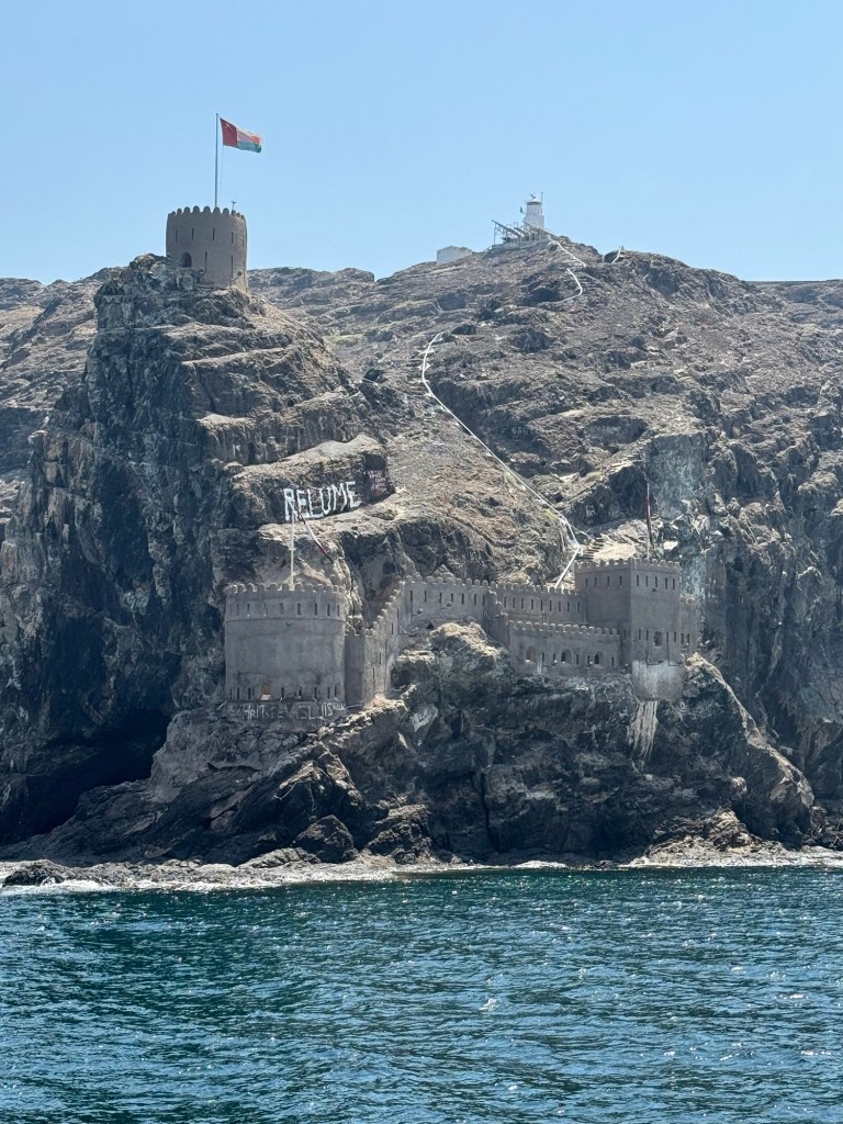 Now we are really getting to the Middle East. Men and women in long clothing. Men in white long coats with a small hat. Women with black coats and scarves. A few ladies with face veils. Oman is a beautiful, clean, and very friendly country. We were in and out in one day. Took a morning tour on a dhow boat around the harbour. This was a wooden boat with that was new but looked very old. Sat on the top deck. We took turns pretending to drive the boat. We saw the king’s official palace, the parliament, the king’s two huge yachts, the left over Portuguese fort and lookout perches from four hundred years ago, the lovely mountains around the city, and two turtles. This peaceful kingdom has been ruled by the same royal family since the Portuguese times. They get along with their neighbors and use their oil to keep up the living standards of the population. Guess what?!? Warm weather with a nice breeze and NO HUMIDITY!!!