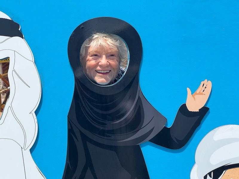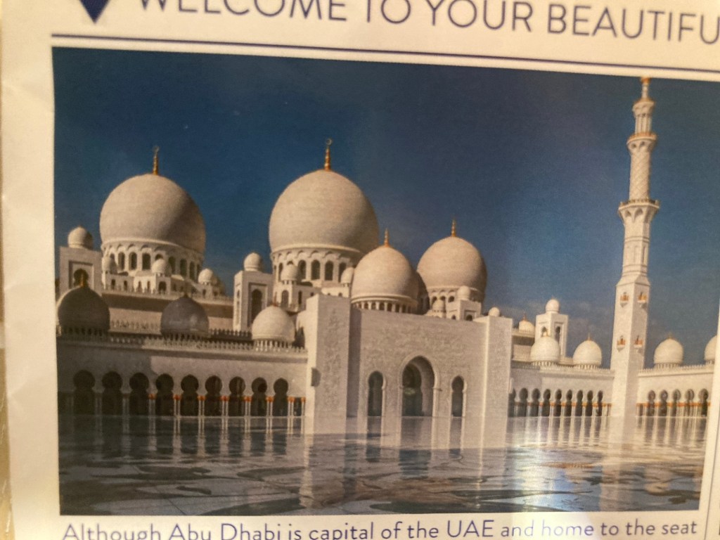 Abu DABI is the capital of the Emerites. There are seven Emerites. We will be here and next door in Dubai after this. Weather is hot but not humid. We are the last ship of the year here again. Will be too hot soon. We went to the grand mosque. It is the biggest in the Emerites and welcomes all people of all religions and races. The mosque is built of white marble and closely resembles the Taj Mahal in the building materials in the inlaid flower decorations everywhere. We wore proper clothes and were adequately covered. We were told about the largest carpet in the world and the six chandeliers made of Italian Morano glass and thousands of crystals. Both were impressive. Well the whole visit was impressive.
