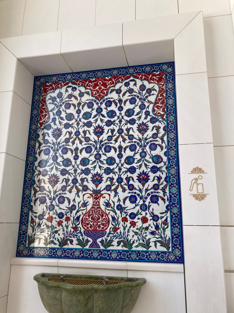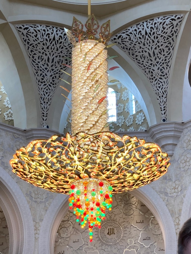 Inlaid semi precious stones One of three chandeliers. Supposed to resemble an upside palm tree. One of three chandeliers. Supposed to resemble a palm tree. This one was inside the middle and of the mosque Floral theme Central court of mosque