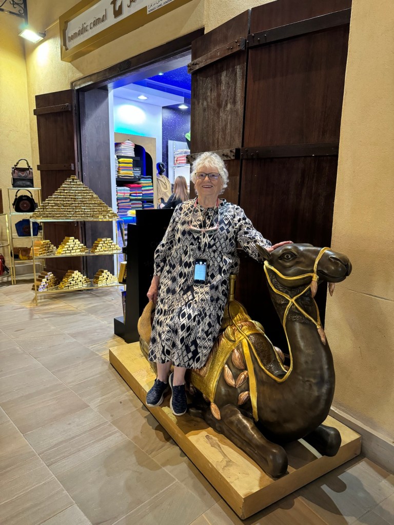 Morning tour of the city. Went to outskirts of city to see Madinat Jumeirah, a mini-city . Five star hotels , ornate souks(shops), and old fashioned air conditioning on the buildings. Basically, towers on buildings that let the hot air escape and cool air come in. Next stop was Burj Al Katlifa, or Burj Al Arab. The world’s largest tallest building. There was really a fantastic view. It seems it is popular to have strange shaped tall buildings. Some lean, some twist, some have spaces in the middle or in various places. One is a giant picture frame just waiting for the picture to arrive. Off to the large(est?) shopping center. It has the world’s largest aquarium. If you were interested, you could sign up for a scuba diving experience I got some chocolate at a See’s Candy shop!!! At one pm, we watched the world’s largest water fountain show outside the center. It beat the one in Las Vegas. (Dubai,you did it again!)Back in the bus to pass palaces on the way to old town. We got in an abra, an old fashioned wooden boat, to cross over a canal to see how people lived before oil was discovered. Buildings made of rock and stucco and a tent set up to show how Bedouin’s lived. Had a camel there. This turned out to be camel day, but more of that later on.