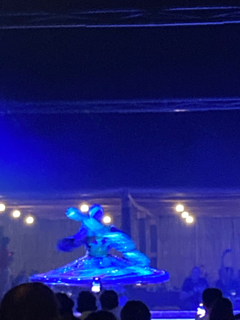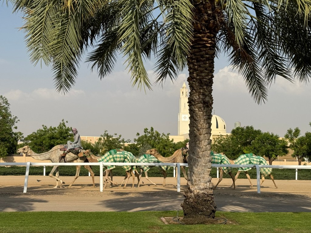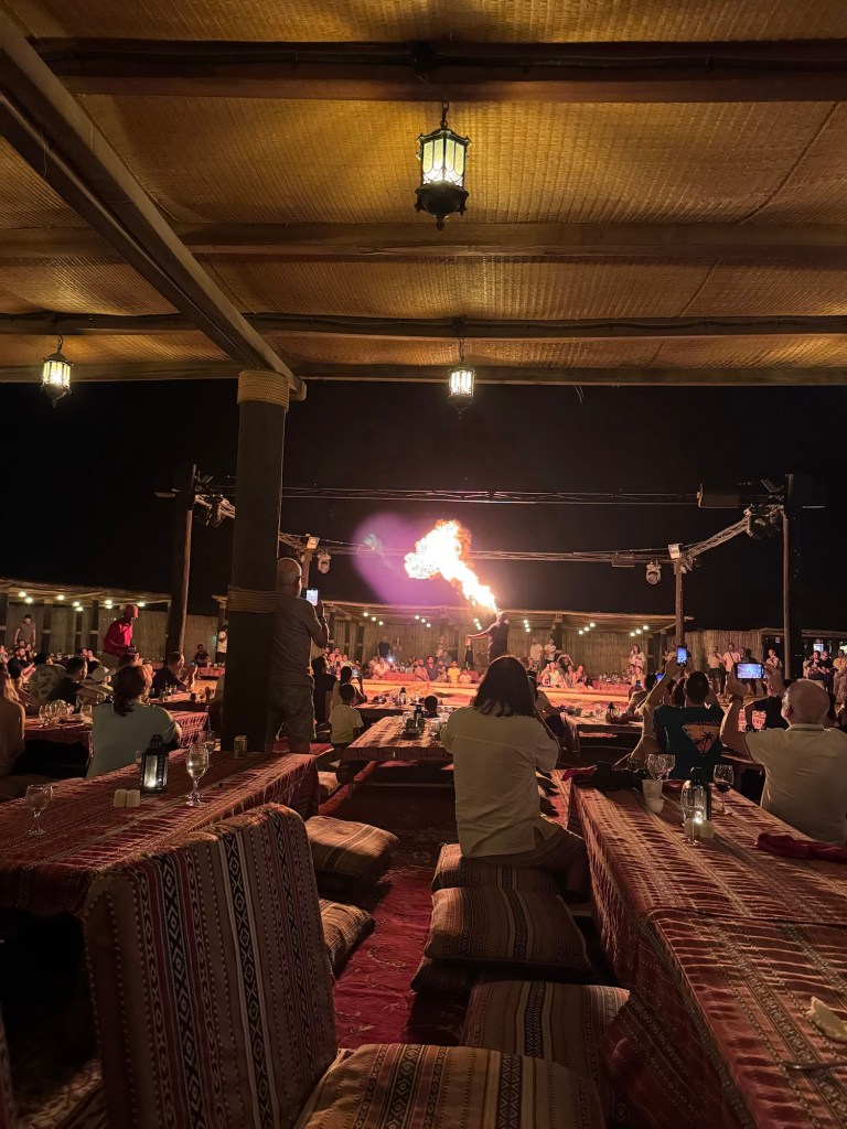 Back to hotel for a rest before the evening excursion. Went by bus for a desert adventure. Stopped by the camel racing grounds to see camels being taken to the track for training. It is just like horse racing. Pedigree and everything except the camel jockey is a mechanical jockey that is handled by a human who has the control and tells the “jockey” what to do. I really want to see a camel race sometime. Got to the parking lot and everyone got into Range Rovers to go to the Dubai Conservation Reserve for an Arabian themed evening. Colinda stayed in the rover when the air was being let out of the tires for the sand dune riding. I waited at the dinner site. She also rode a camel and rolled off when the camel was kneeling to let her off. No injury. Soft sand. So that is what the more about camels I mentioned was all about We ate an Arabian BBQ under tents with rugs under the stars. There were three entertainers. A whirling dervish, a belly dancer, and a fire dancer who twirled and “ate”fire. What a day!