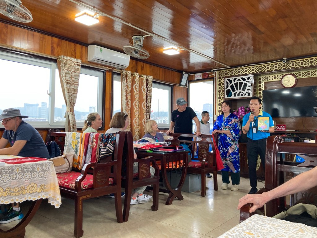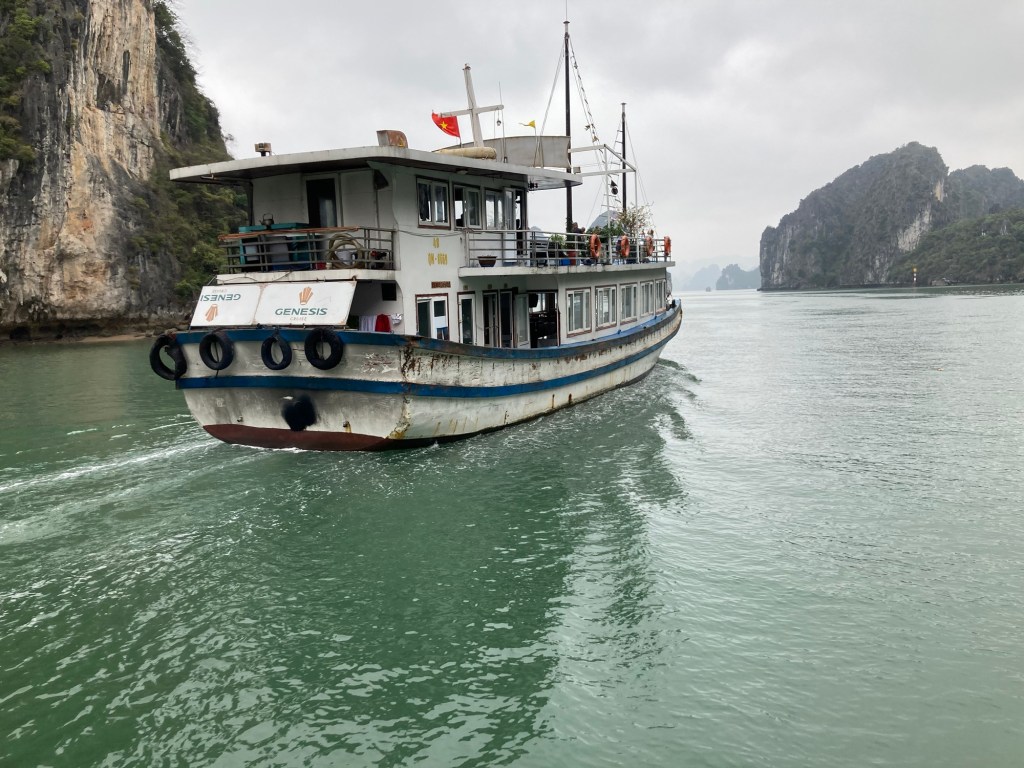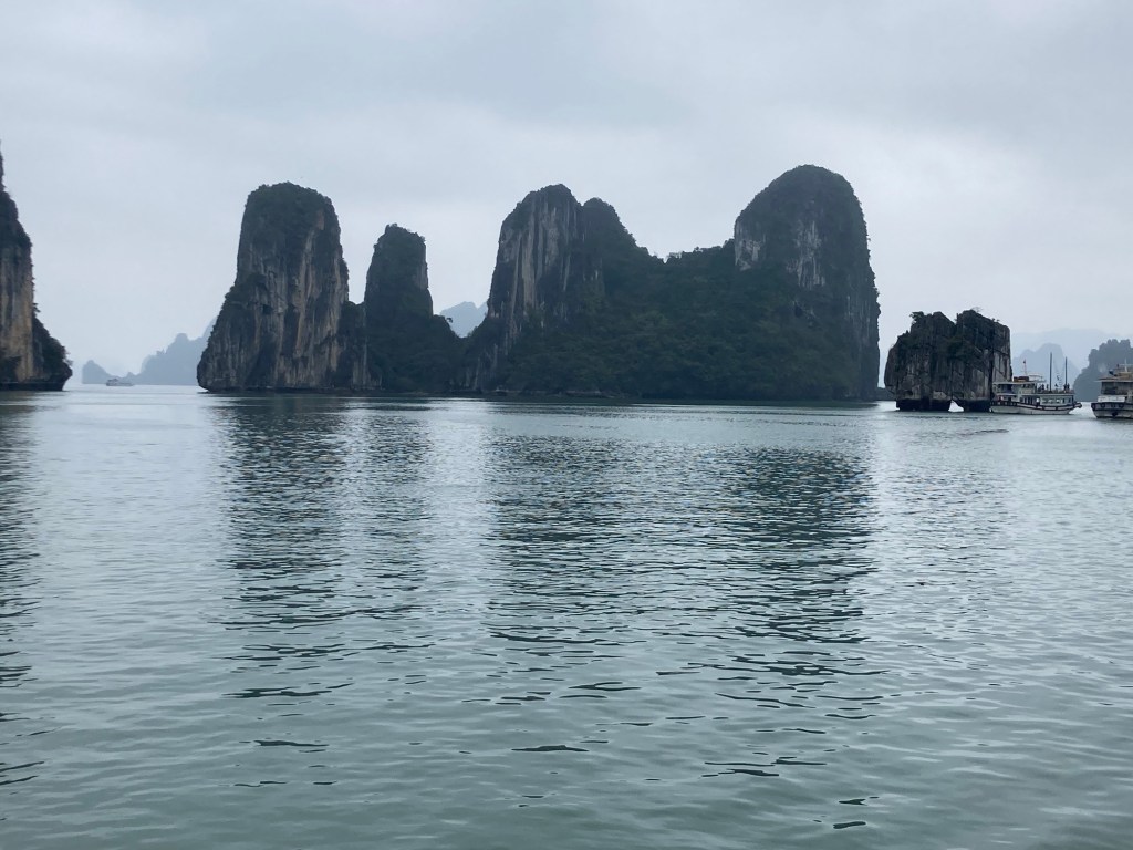 Up early docked next to a huge German cruise ship. At least 50 busses lined up waiting for tours. We went on a boat tour to see the 1,600 limestone mountains in the bay. We had very hazy weather so everything different shades of gray. Many interesting boats on the waters. Mostly tour ships, but also fishing boats, and long barges taking coal back and forth. Coal is the major way to get electricity here. The boat was very elegant. The staff spent a lot of the voyage trying to sell us trinkets. Passed a pearl farm where divers work on the oysters. Lots of people live on boats here. Not too hot and sticky today. I expect it will get hotter as we go to DaNang in the middle of the country next.