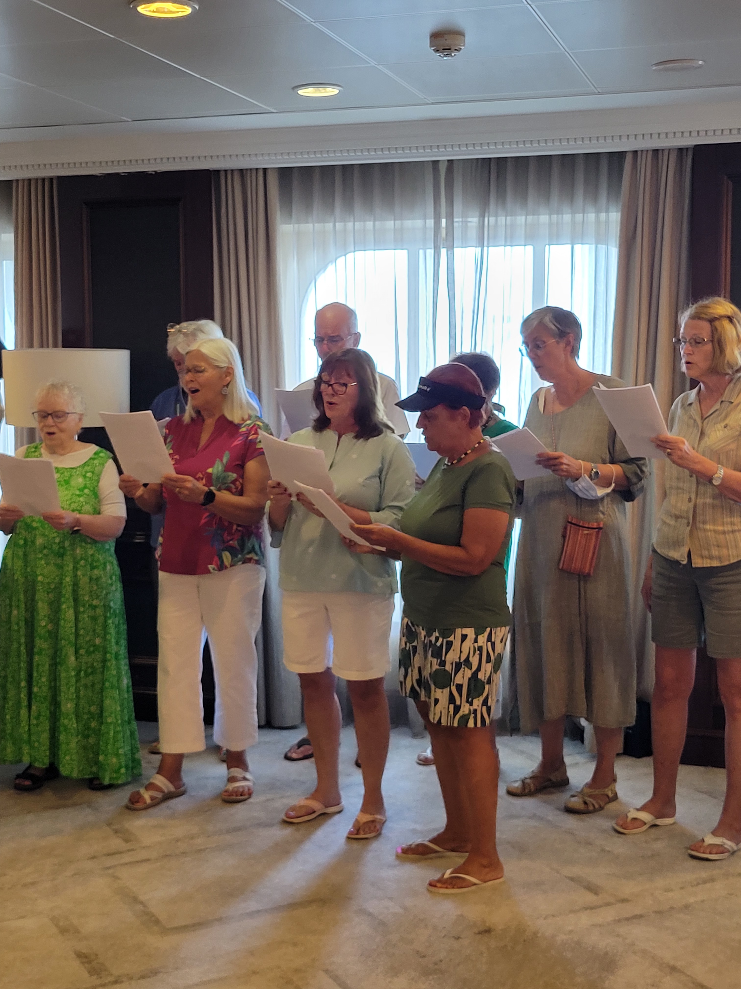 St. Patrick’s Day was fun! There were 70 participants in the pub crawl! After a few drinks before they got there, they turned out to be a good and cheerful audience. We sang…My Wild Irish Rose, Danny Boy, Irish Lullaby, When Irish Eyes Are Smiling, and one we never heard of the starts like this…If you’re Irish, come into the parlor, there’s a welcome here for you. No more choir for a while. We only practice on sea days and we will not be having many more for a while. From now on no more small little islands full of charm and will be in big cities. Will have many more hot days ahead. I have a picture of us singing. I have on a bright green dress I bought for the day. Will be good to put on in the heat.